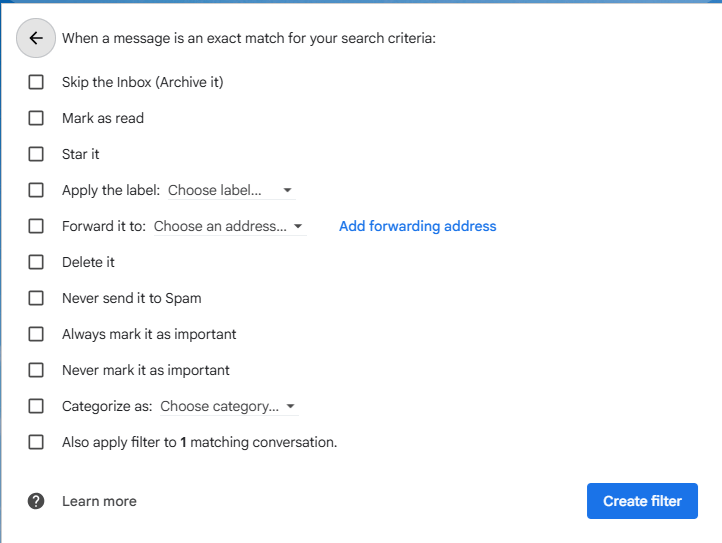 Select “Create Filter”. You will be given the following options: