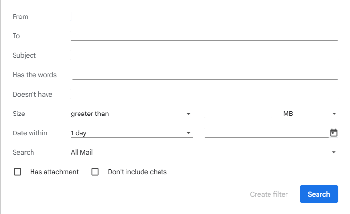- emails that have an attachment (check the “Has Attachment” box) and