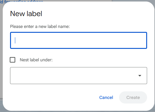 Give your label a name. As you go through this process you might want to use a label as a sort of ‘subfolder’ underneath a broader label category. If you want to do that, check on the box next to “Nest label under:” and select the label of your broader category.